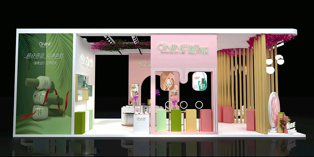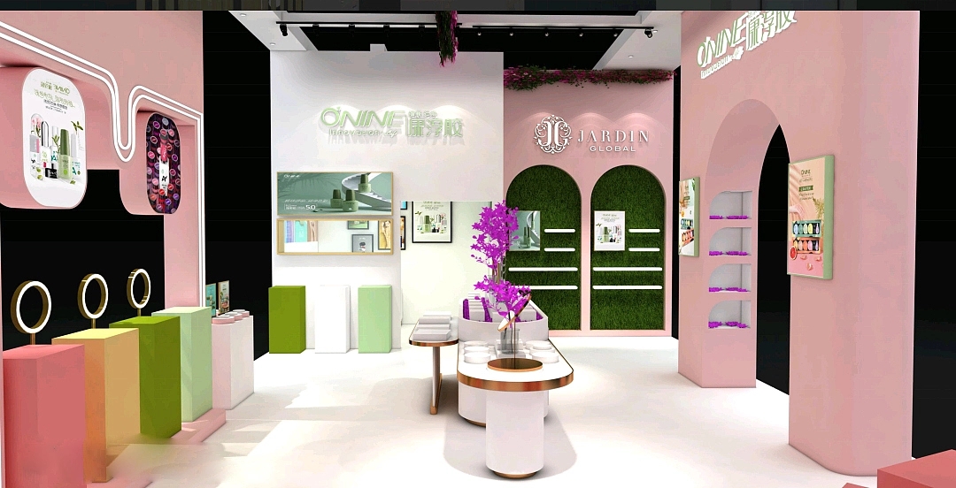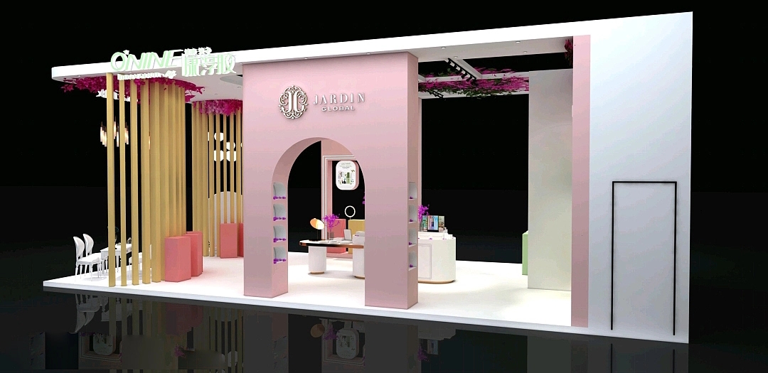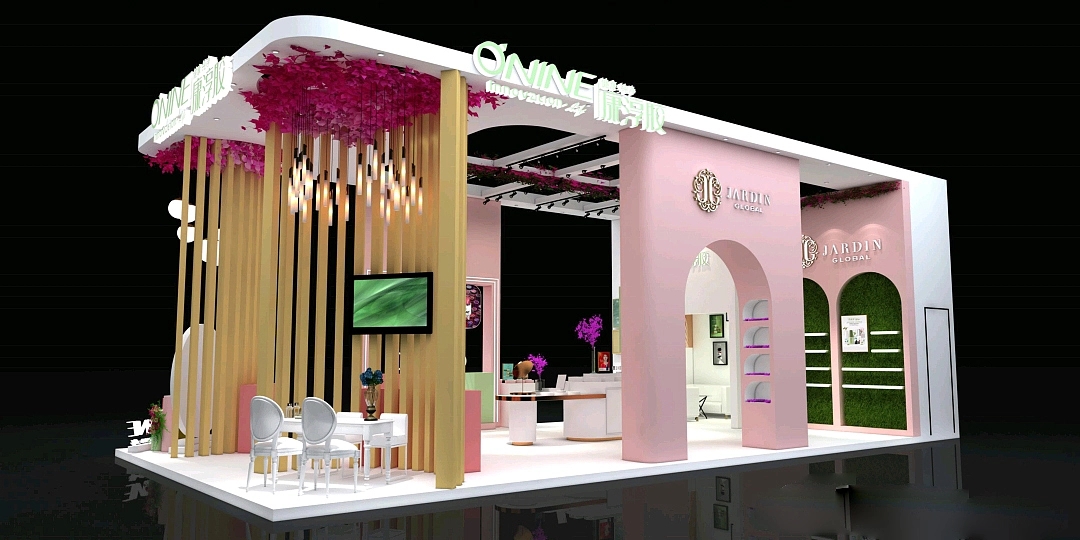 展臺設計搭建氛圍非常的少女,展臺一側的體驗區用木架和花瓣頂搭配上懸掛的燈,構造了一個仿佛花園庭院的空間氛圍,其展臺裝修使用了粉色作為主色,既夢幻又少女,整個展位設計十分吸睛,簡單又不失少女的可愛。
