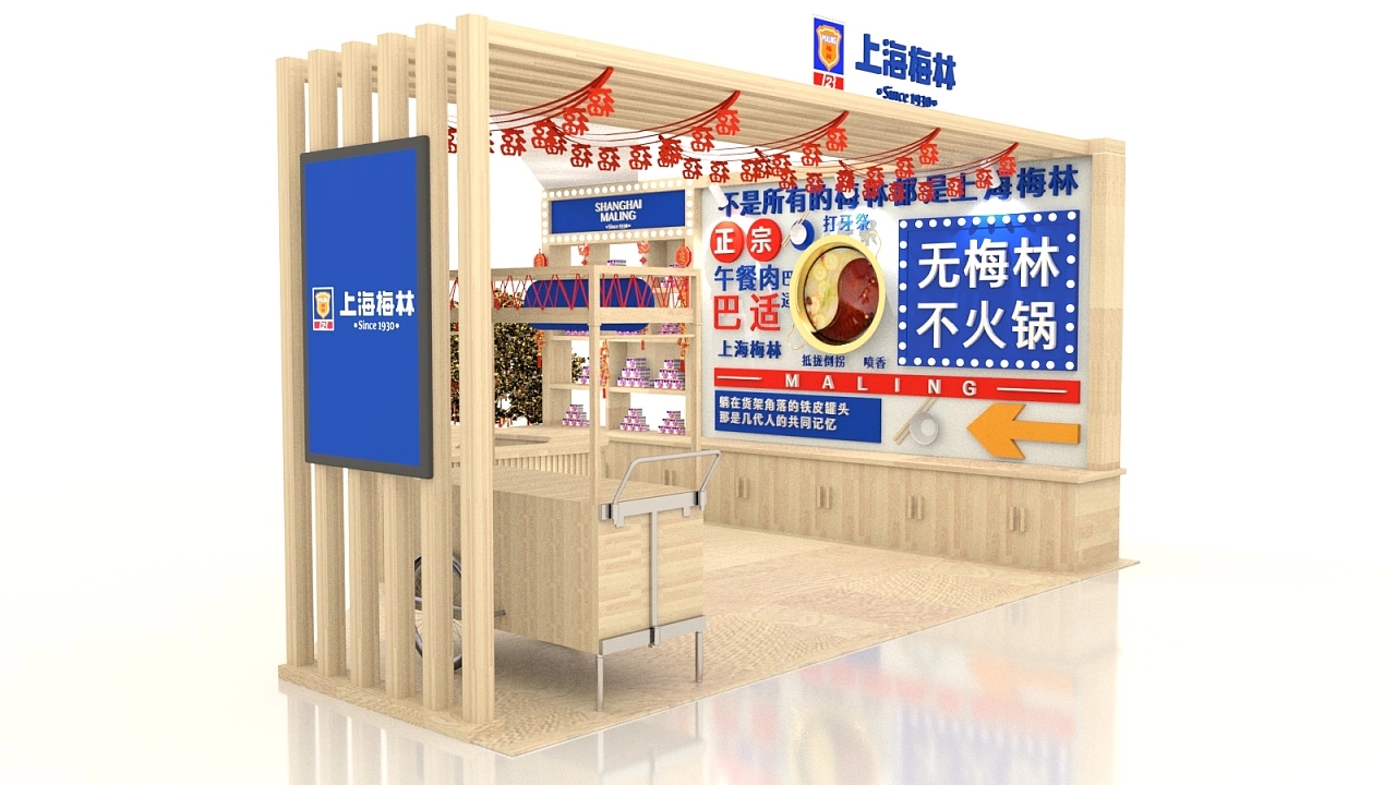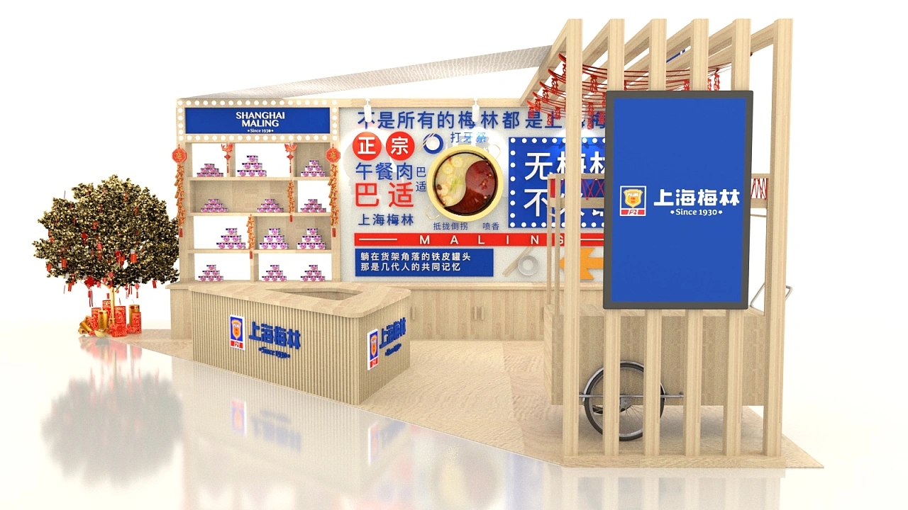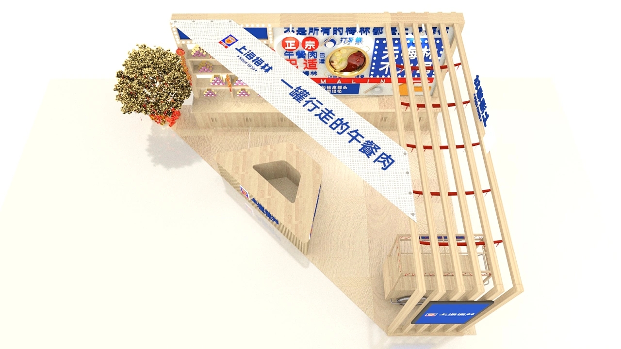 展臺設計搭建充分利用了空間,將布置搭建做了簡化處理,整個展臺只有一面標語墻用于展示該企業的文化價值,懸掛的鞭炮、絲帶以及地面擺放的發財樹展現出新年的氣象,在展臺搭建材質上使用了木質結構,既能降低展臺布置搭建的費用,又能起到環保的作用。
