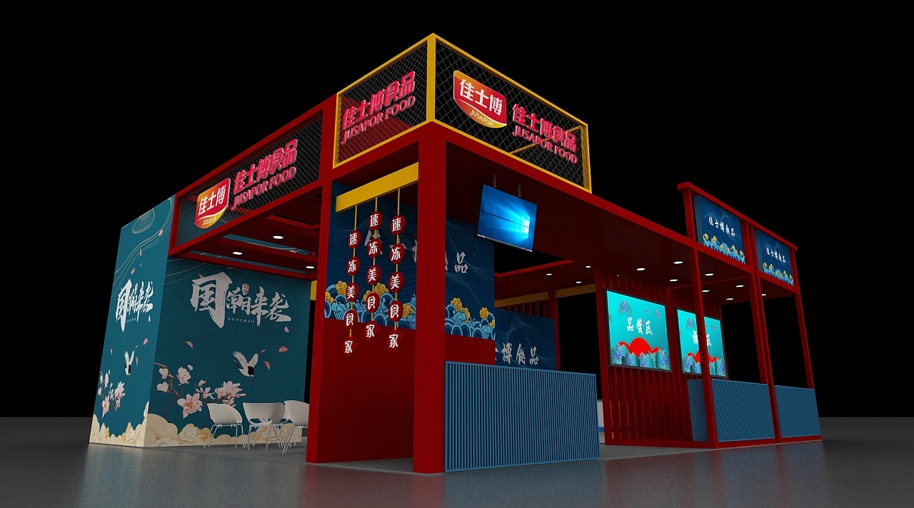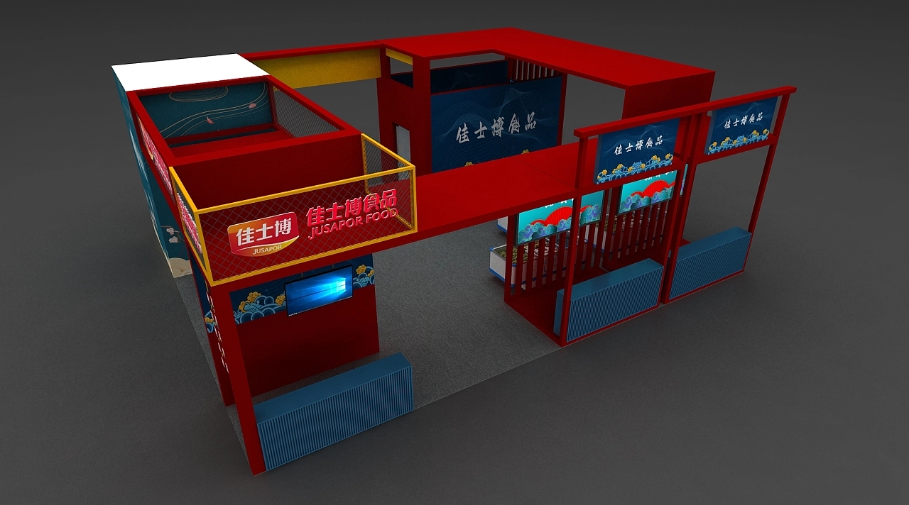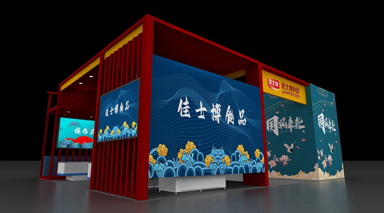 該展臺搭建面積為72平方米,主要布局氛圍前臺接待區、客戶洽談區、產品展示區、儲藏室等各功能區,造型上使用了立方塊、柵欄等形狀,打造展臺的空間感。展臺設計使用了國潮作為展臺設計的主題,顏色上使用了紅藍色系做搭配,墻面上還有國風插畫,整個展臺設計高端大氣,國潮氛圍撲面而來。